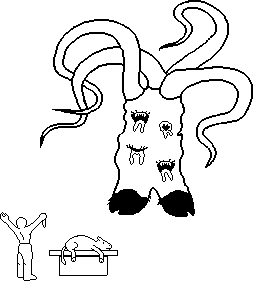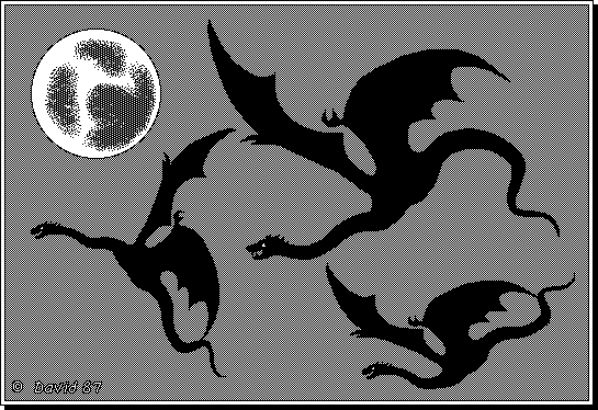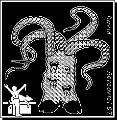 Professeur émérite consultant un vieux grimoire. Vieille image exhumée, créée avec… un crayon et du papier ! Ça avait du bon la vieille méthode ! Bon, c'est ma sœur qui l'a scannée en 1993, fallait bien céder au progrès un jour…